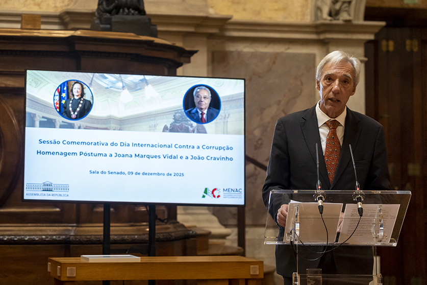 O vice-presidente do Conselho Superior da Magistratura, juiz conselheiro Luís Azevedo Mendes, participou, no dia 9 de dezembro, na sessão comemorativa do Dia Internacional Contra a Corrupção, que decorreu na Assembleia da República, promovida pelo Mecanismo Nacional Anticorrupção (MENAC). A iniciativa integrou uma homenagem póstuma a Joana Marques Vidal e a João Cravinho – um reconhecimento pelos seus contributos para a defesa da integridade, da transparência e do interesse público.