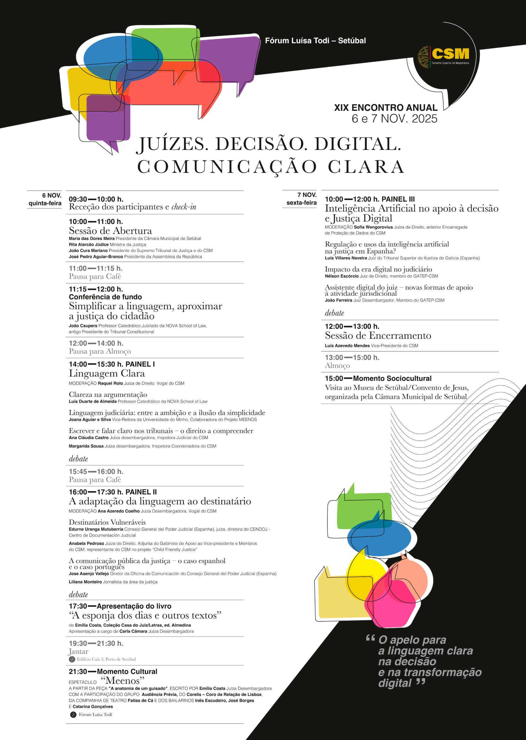 O Conselho Superior da Magistratura realiza, nos dias 6 e 7 de novembro, o XIX Encontro Anual em Setúbal, sob o tema “Juízes: o apelo da linguagem clara na decisão e na transformação digital”.